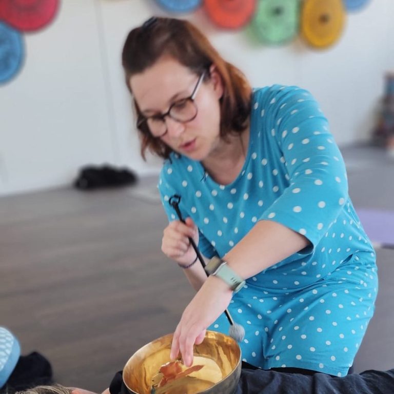 Sie entführt dich in die Welt der Klangreisen, die Klangschalenmassage und gibt Einblicke in die Wellnessanwendung mit Aromaölen und Blockadenlösung mit Farbbrillen.